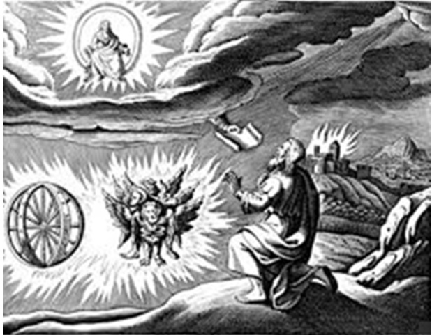 Suatu hari Tuhan memberikan satu penglihatan kepada Yehezkiel. Kemuliaan Tuhan menampakkan diri sebagai satu cahaya yang terang benderang, di tengah-tangah itu juga ada yang menyerupai makhluk hidup. Masing-masing mempunyai empat muka dan empat sayap. Di atas mereka ada takhta safir yang indah, yang dipenuhi dengan sinar berkilat seperti pelangi. Saat Yehezkiel melihat itu dia sembah sujud.